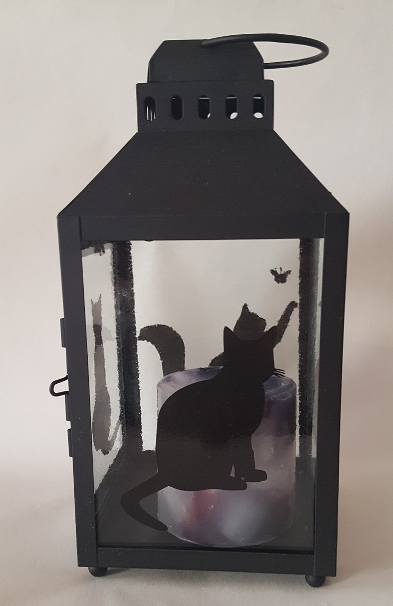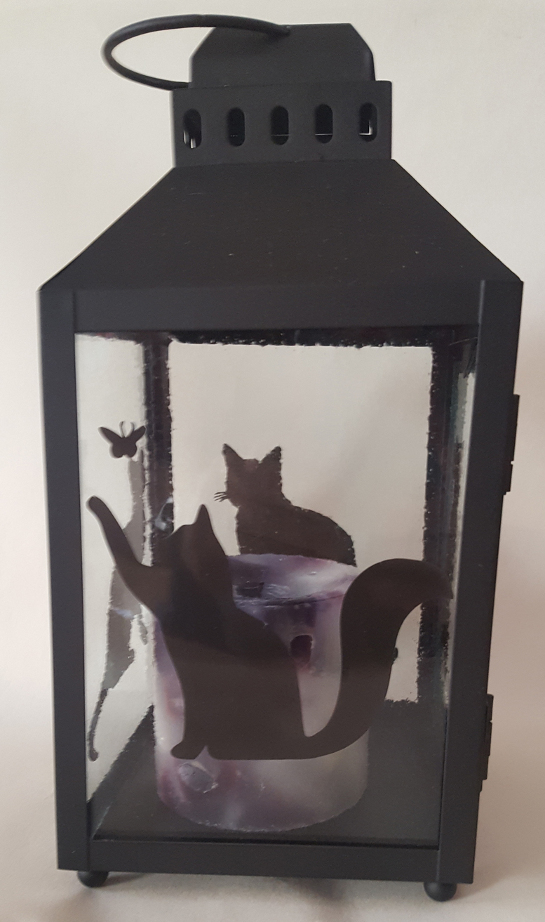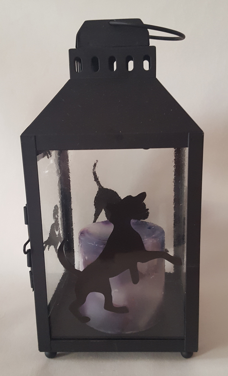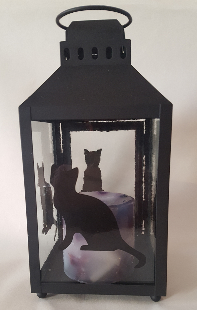 | Cats Hurricane Candle Lantern This lantern features a different fused silhouette of a black cat on each side. Great gift for cat lovers! lt measures approximately 10" high by 4 3/4" wide and deep. sold |