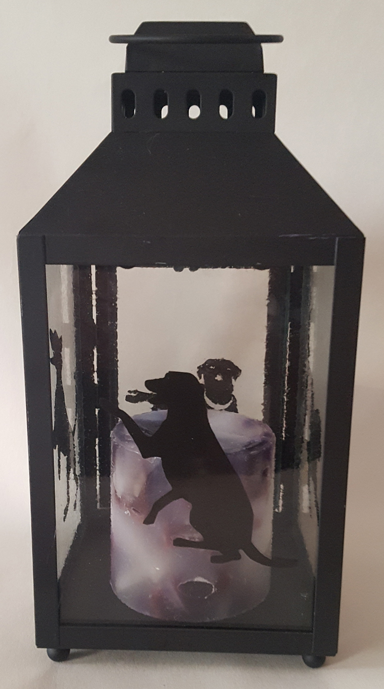 | Dogs Hurricane Candle Lantern This lantern features a different fused silhouette of a black dog on each side. Great gift for dog lovers! lt measures approximately 10" high by 4 3/4" wide and deep. $35 |