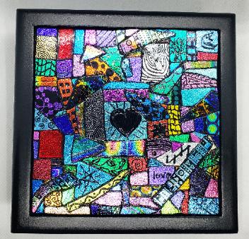 | Wooden Jewelry/Keepsake Box with Hand-engraved Dichroic Tile This is a black wooden box with a panel of hand-engraved dichroic fused glass. The process of making them is very labor-intensive and no two are alike. Will hold your special things in style! The whole box measures approximately 5.25" square and the dichroic tile is approximately 4.25" square. $50 |