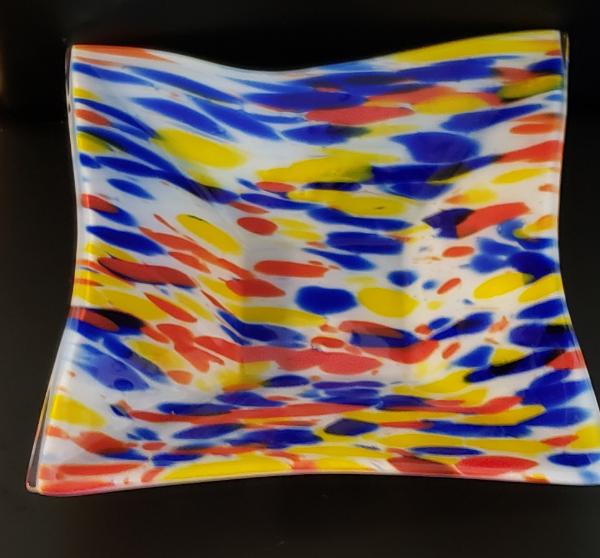 | This amazing fused glass rainbow swoop bowl features 1" squares of glass in red, orange, yellow, green, turquoise blue, cobalt blue, and purple. The transparent glass is iridized on the front side (the top of the bowl) to add sparkle and depth. In between the squares of glass are small spaces that let light through even more and provide an interesting look. What is really cool about this bowl is that when placed in the light, it casts a colorful shadow as seen in the pictures! This bowl would make an awesome decorative piece! It measures approximately 10" across the middle of the bowl both ways. The sides swoop up so measurement on the sides is about 8 3/4". sold |
